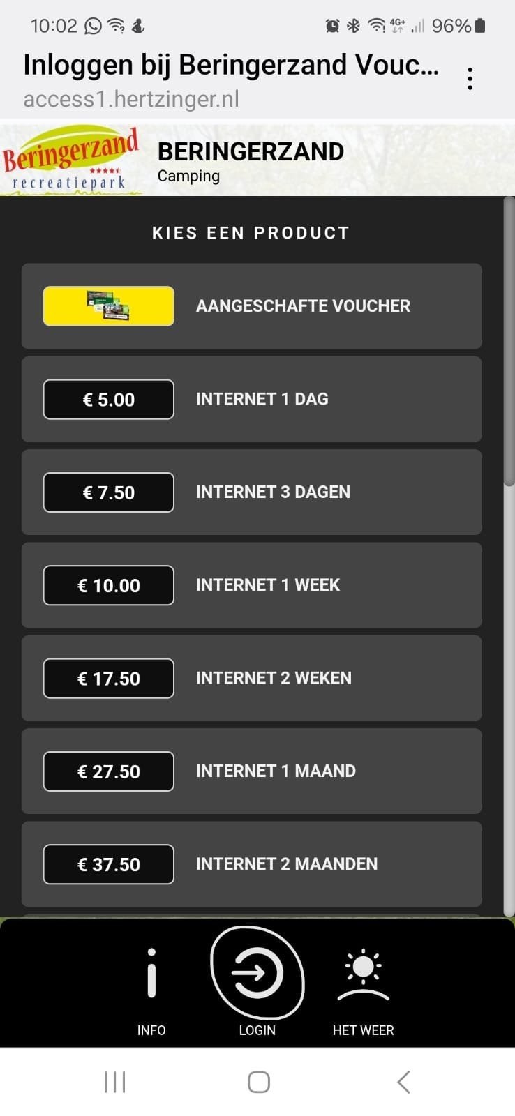 Vervolgens kun je kiezen voor een aangeschafte voucher, klik hierop. Vul de code in die op het briefje staat wat je van de receptie hebt ontvangen. Klik een aantal keer op akkoord/inloggen en je bent ingelogd.